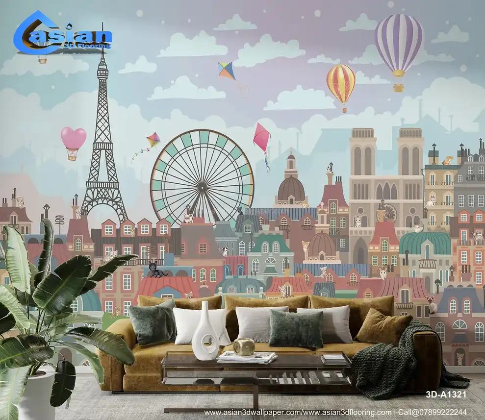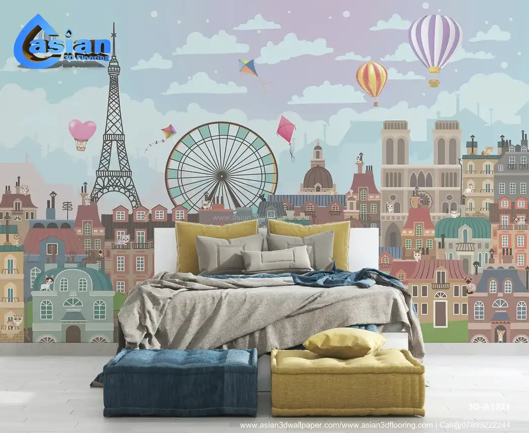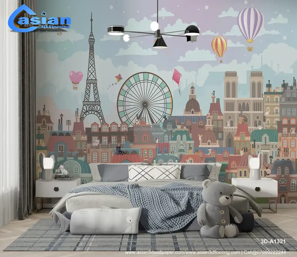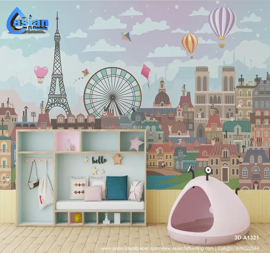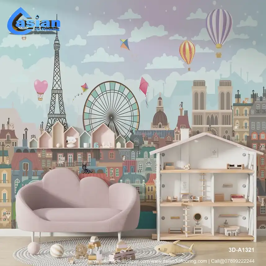Bring a touch of Parisian charm to your child's room with this delightful cityscape wallpaper. Featuring the iconic Eiffel Tower, colorful hot air balloons, a Ferris wheel, and playful kites soaring in the sky, this design evokes a sense of wonder and adventure. The whimsical buildings and adorable cats perched on rooftops add to the enchantment, making it perfect for a kids' bedroom or playroom. The soft pastel tones and engaging illustrations create an inspiring and imaginative space. Benefits:- Transform any child's room into a whimsical Parisian dream with this delightful wallpaper featuring the Eiffel Tower, colorful hot air balloons, and adorable cats.
