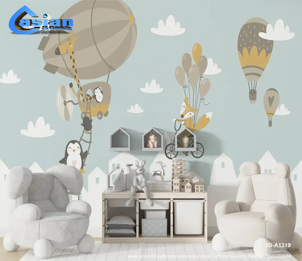 This whimsical wallpaper showcases a bear in a hot air balloon, a fox, a mouse playing a drum, and other friendly animals surrounded by lush tropical greenery. Ideal for children's rooms or nurseries, it creates an enchanting, nature-inspired atmosphere. Benefits:- Perfect for creating a playful and imaginative space for children, with delightful animals in a lush tropical jungle.