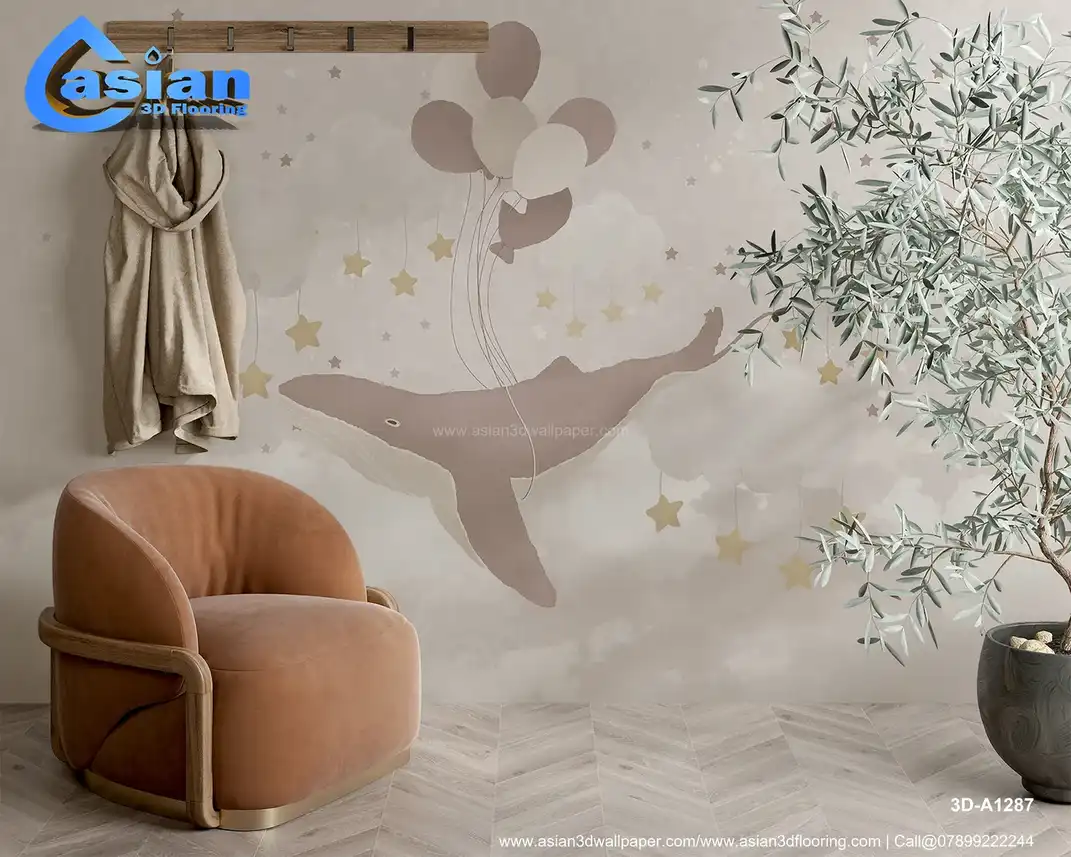 This whimsical wallpaper features a cute whale soaring through the clouds with a bouquet of balloons, surrounded by fluffy clouds and golden stars. The soft pastel color palette with shades of gray, beige, and soft pink makes this design perfect for a serene, dreamy nursery or child?s bedroom. The gentle, calming tones and whimsical design create a magical, peaceful atmosphere. Ideal for children?s spaces, adding a touch of fantasy and joy to the room. Benefits:- A magical wallpaper with a whale floating through clouds with balloons and stars, perfect for creating a calming and dreamy atmosphere in children?s rooms.