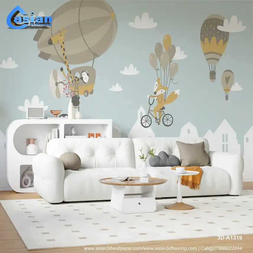 This playful wallpaper brings a whimsical animal adventure to life, featuring a giraffe flying in a hot air balloon, a fox riding a bike with colorful balloons, and penguins climbing a ladder towards the sky. The soft blue background and pastel tones make it a perfect addition to any child's room, creating a fun and imaginative atmosphere. Ideal for nurseries, playrooms, or bedrooms, this wallpaper inspires creativity and joy in little ones. Benefits:- Bring a sense of adventure and fun to your child's space with this whimsical animal-themed wallpaper featuring hot air balloons, penguins, and a fox.