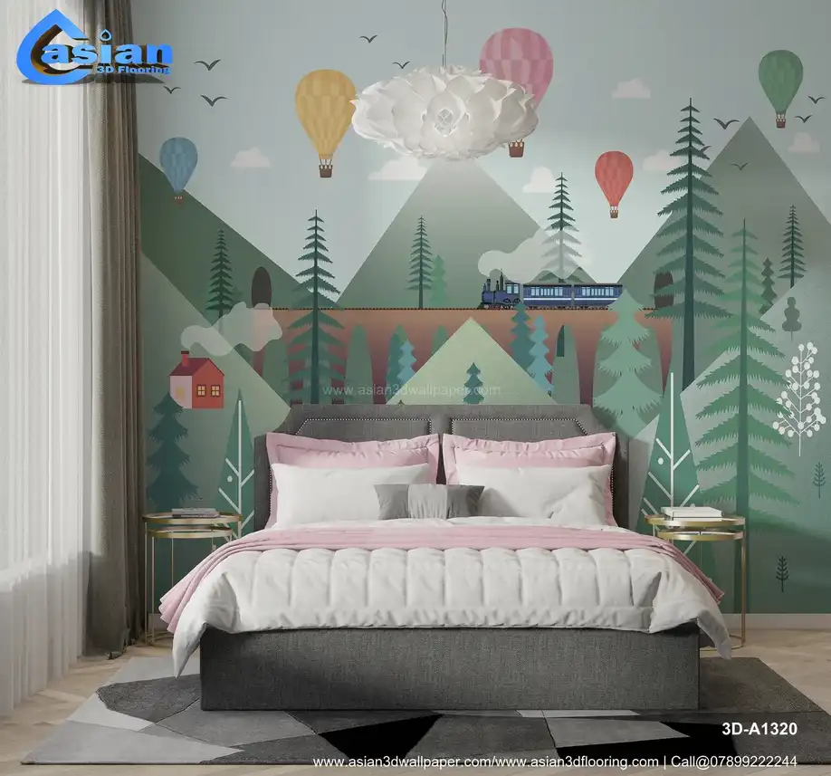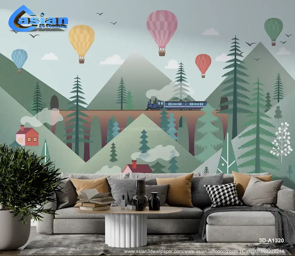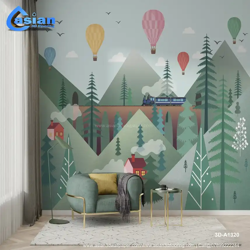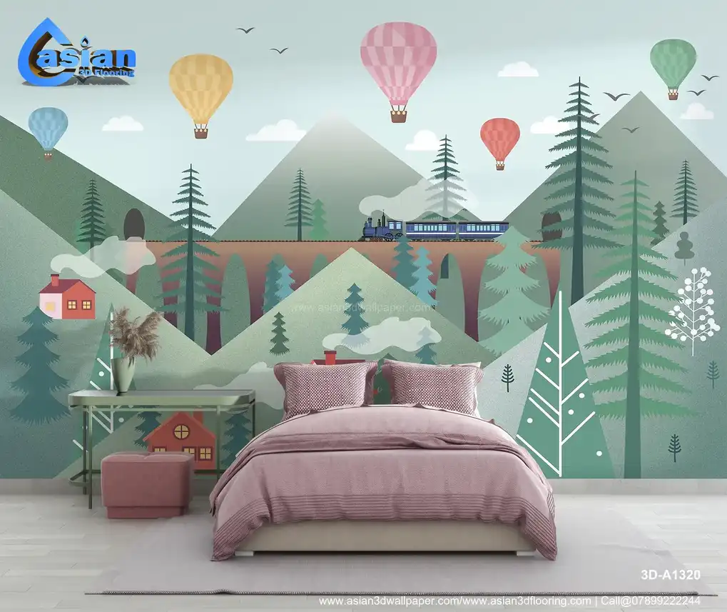 This enchanting wallpaper features a picturesque scene with colorful hot air balloons floating above green mountains, a steam train chugging along a scenic track, and quaint houses dotting the hillsides. The soft pastel background creates a dreamy atmosphere perfect for inspiring adventure and imagination in kids' bedrooms, playrooms, or nurseries. The whimsical design is both calming and fun, making it ideal for a child's creative space. Benefits:- Create a fun and imaginative space for your child with this whimsical wallpaper featuring a steam train, hot air balloons, and beautiful mountains.