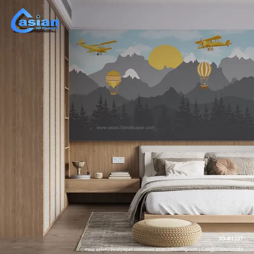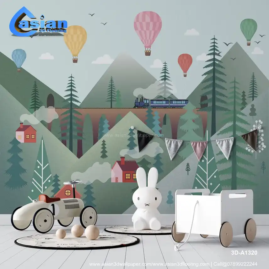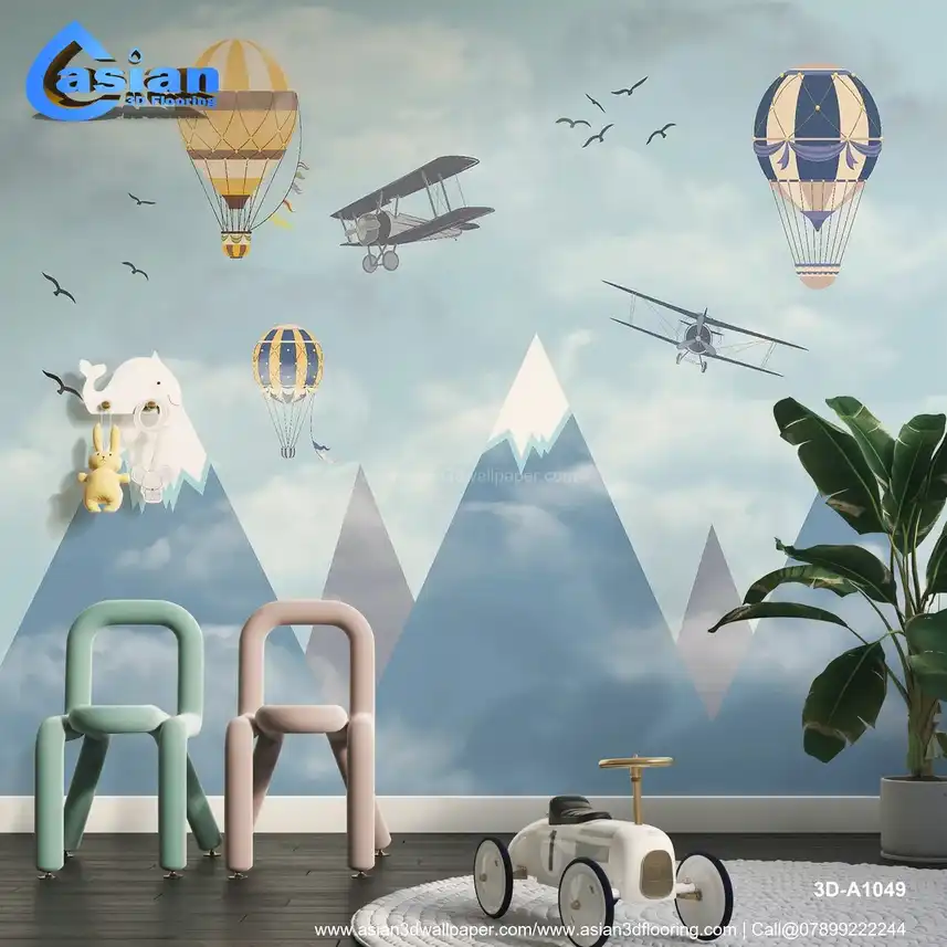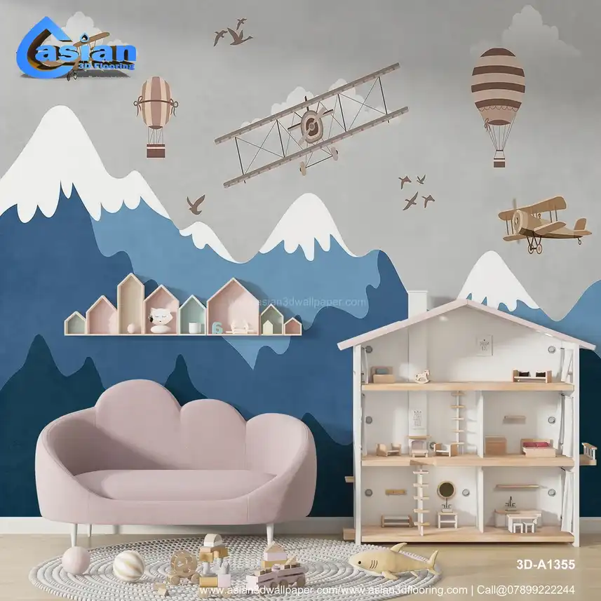 Whimsical Mountains and Air Travel Kids Wallpaper