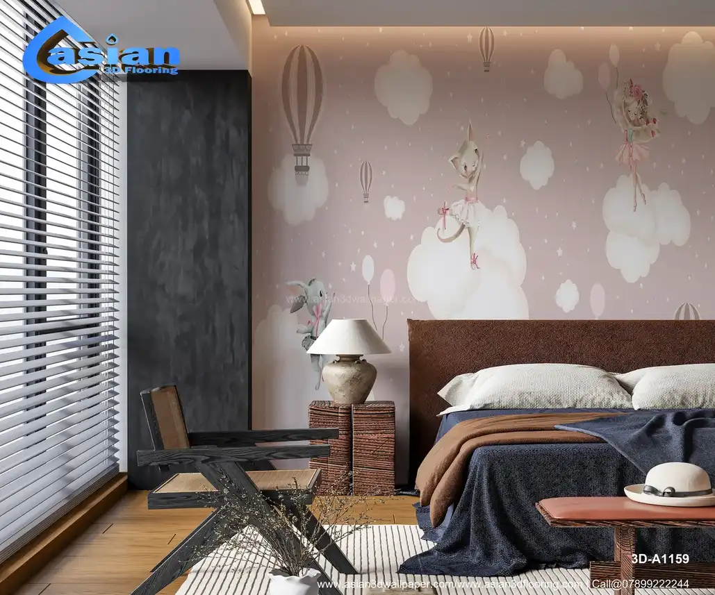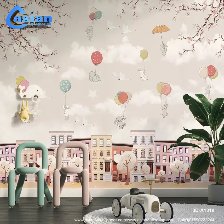 Whimsical Bunnies with Balloons and Cityscape Wallpaper for Kids